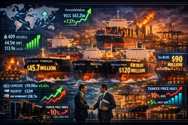 Bulker S&P slowed early December with just 14 transactions despite firm freight and charter rates, but values firmed up—capesizes up 5.42% for 20-year-olds to $19.06 million. Notable sales include NGM Shipping's profitable flip of the 14-year-old Japanese-built Pacifist from $19 million to $32 million, and NYK Bulkship's $18.7 million sale of the 2012-built NBA Rembrandt to ArcelorMittal Shipping.